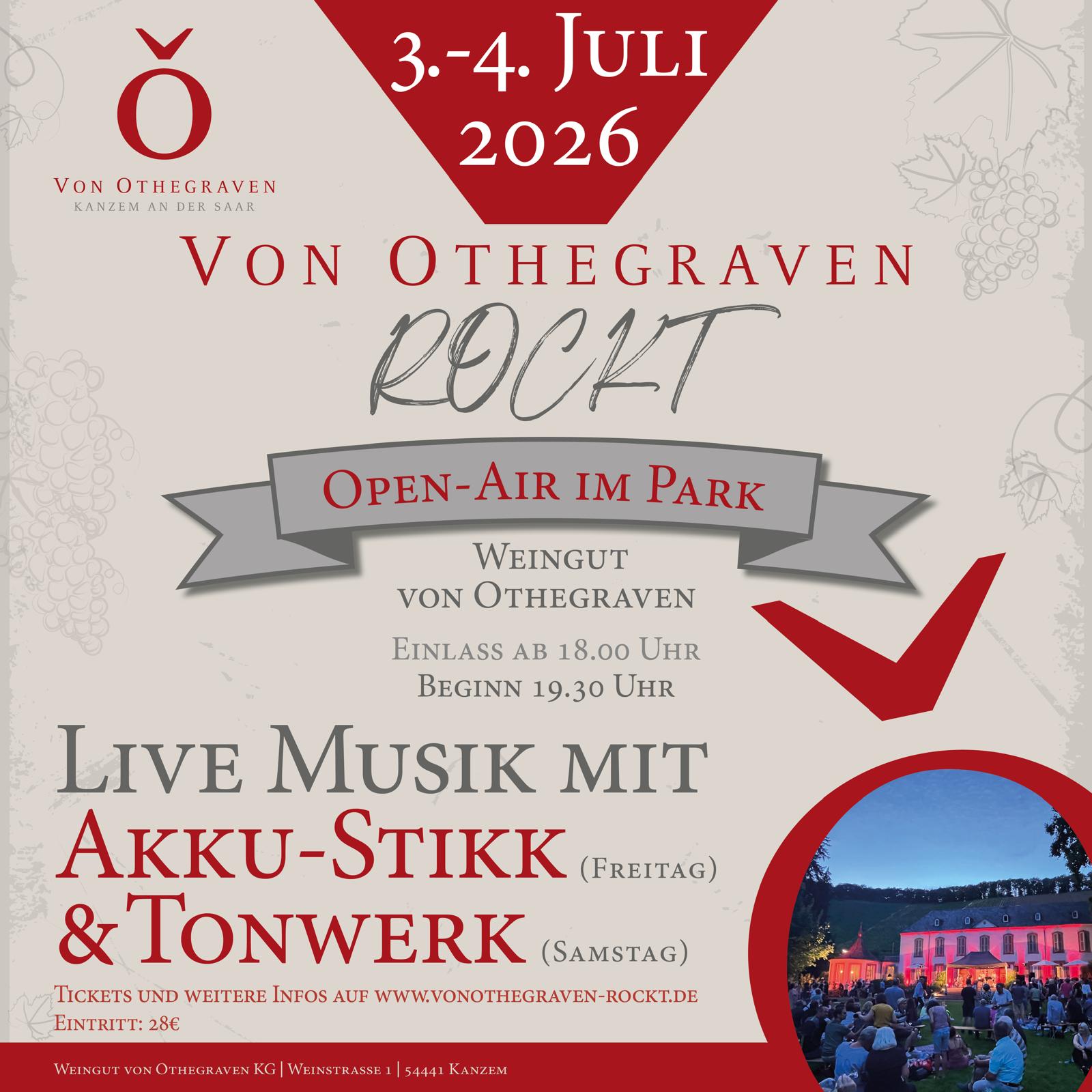 Tickets sind sowohl online als auch im Weingut Von Othegraven erhältlich. Sichere dir jetzt dein Ticket und erlebe einen unvergesslichen Abend voller Musik, Wein und Genuss!